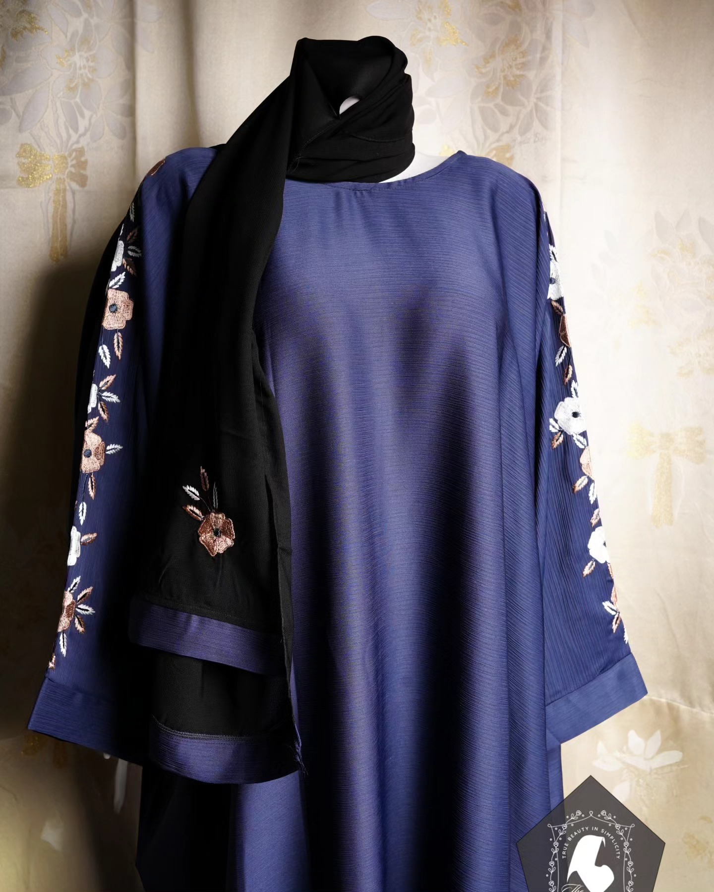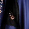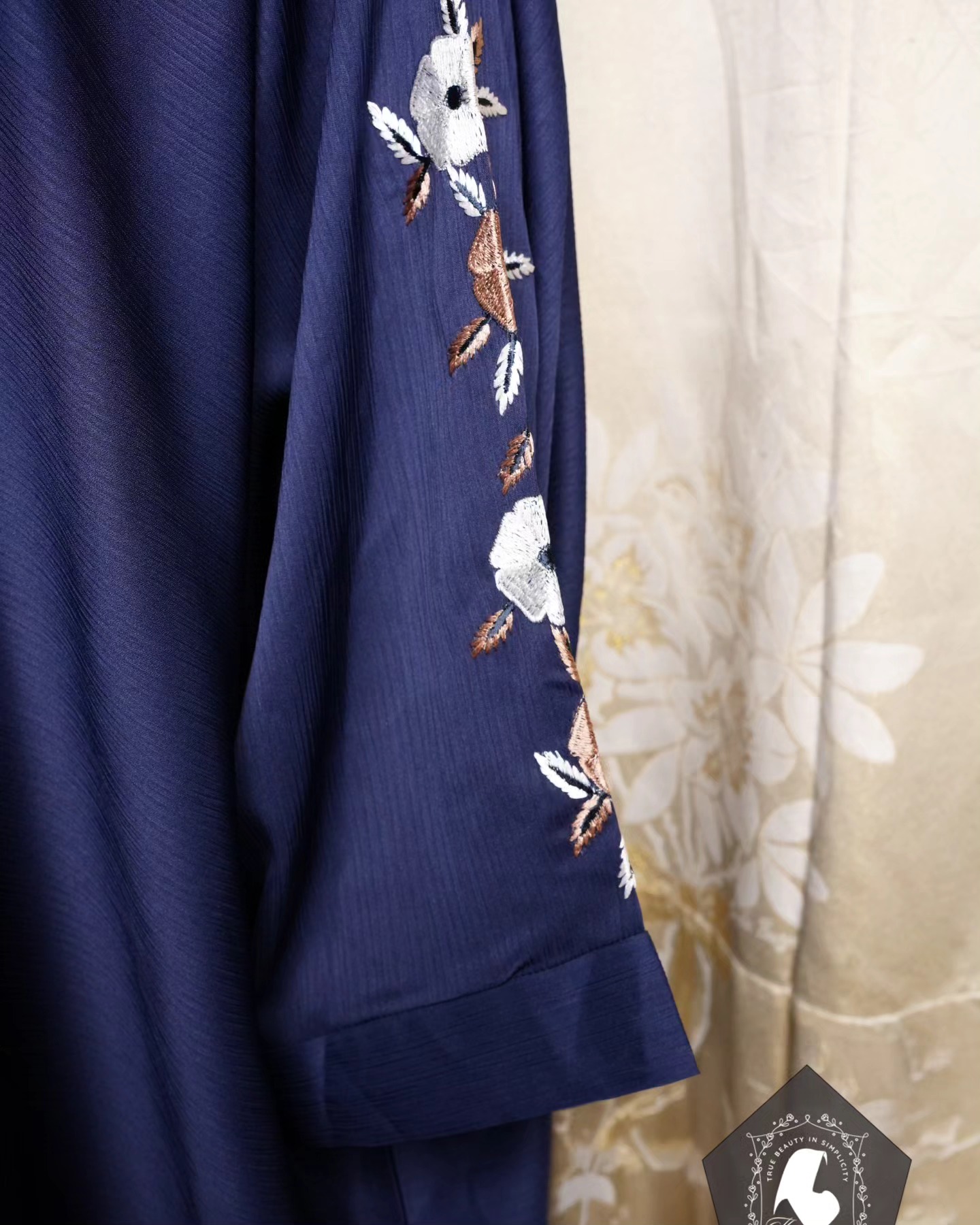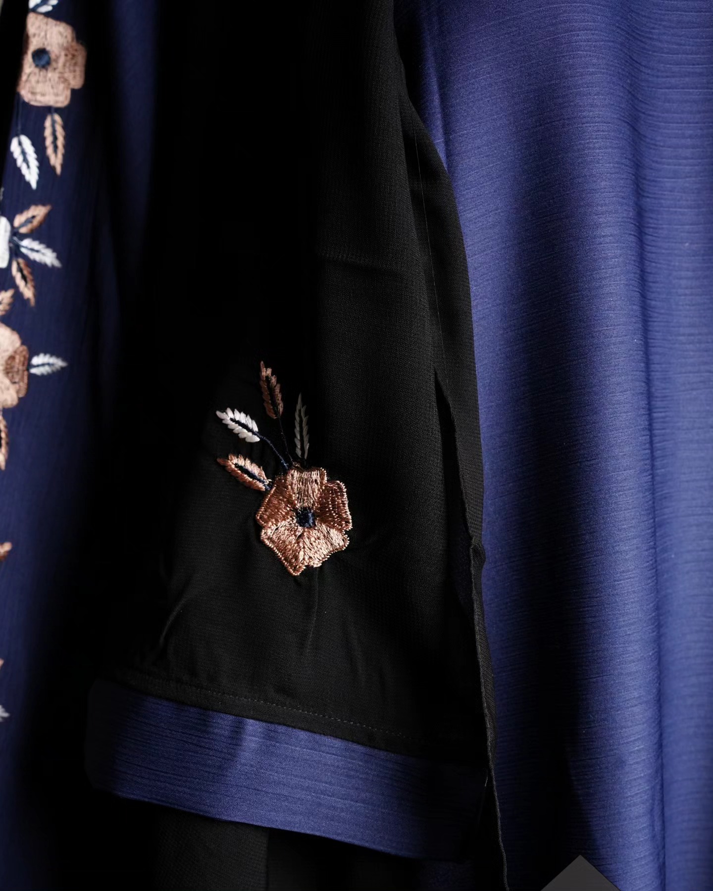 Exquisite Floral Embroidery: Beautiful white and brown floral embroidery on the sleeves, offering a refined and artistic detail.